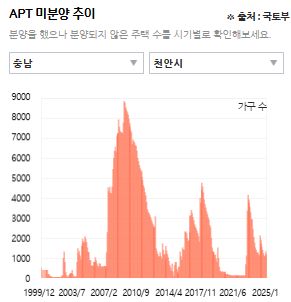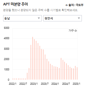 천안의 미분양은 23년에 최고치를 찍고 점점 줄어들고 있는 추세이다.