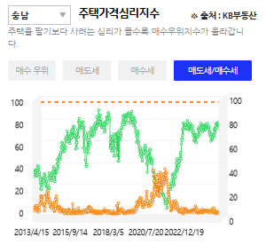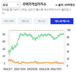충남의 매수세와 매도세는 23년과 24년에 매도세가 좀 줄어들다가 현재는 다시 매도세가 높은 수준이다.