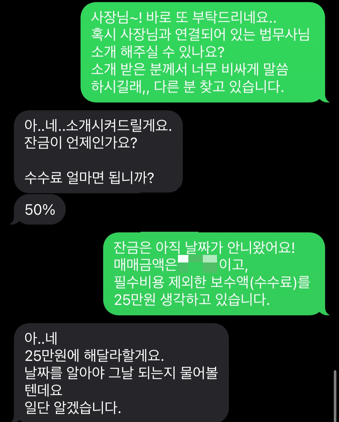 투실: (배운대로) 법무사님~! OO부동산 소개로 연락드립니다. 필수 비용 제외하고 수수료 25만원에 진행하고 싶습니다.법무사: 25만원이면 건물 1억짜리라도 안해요.
