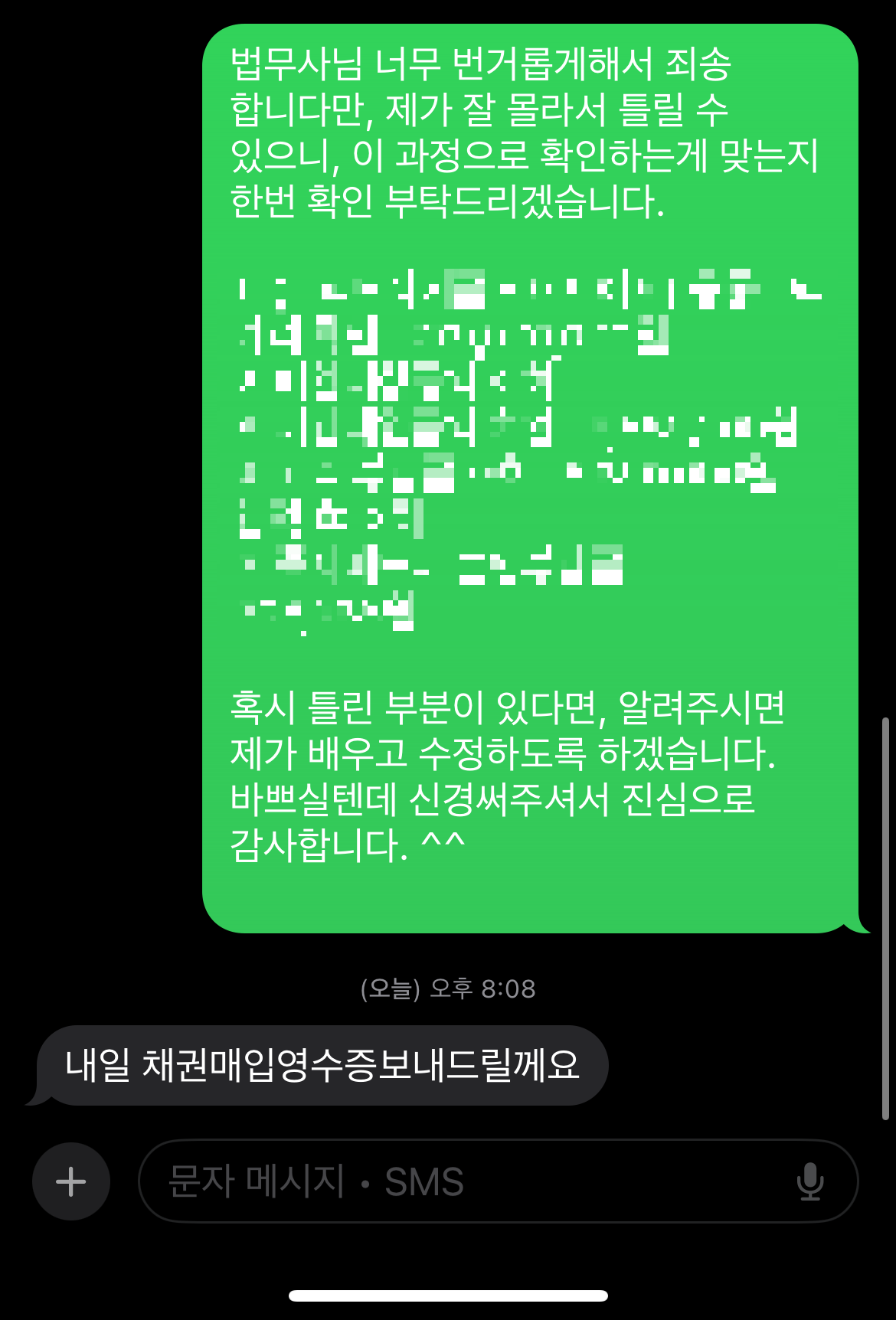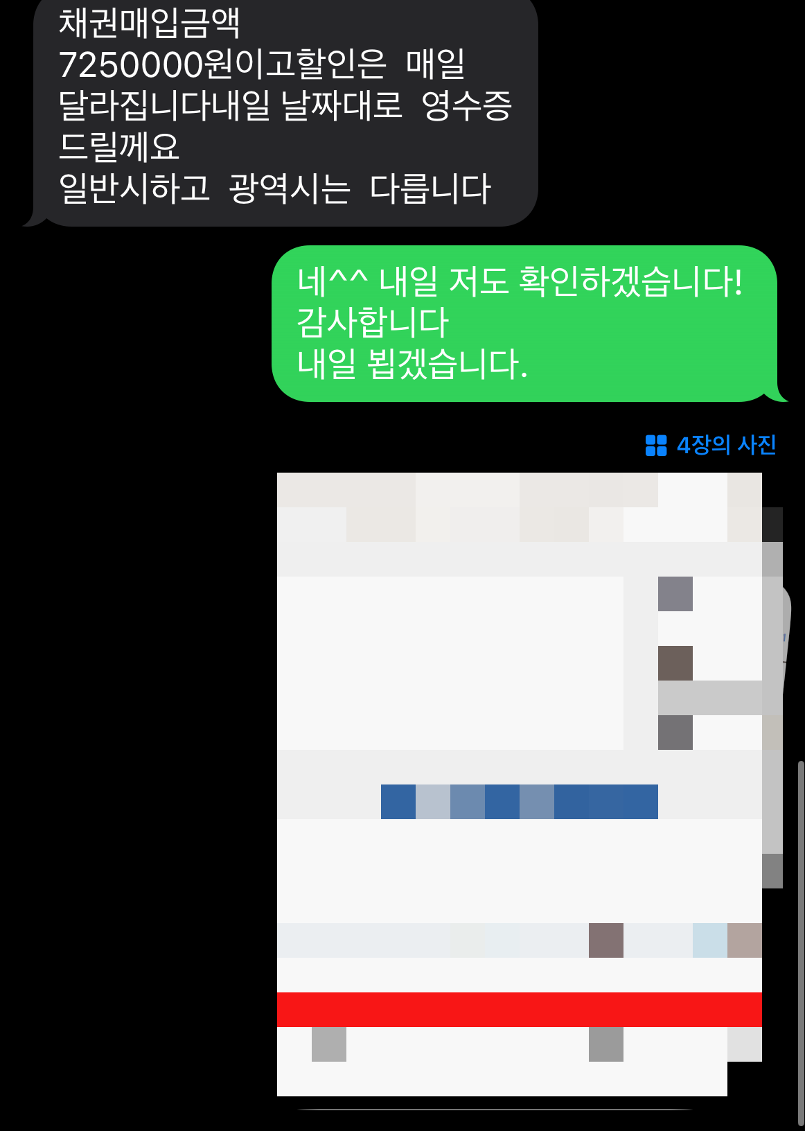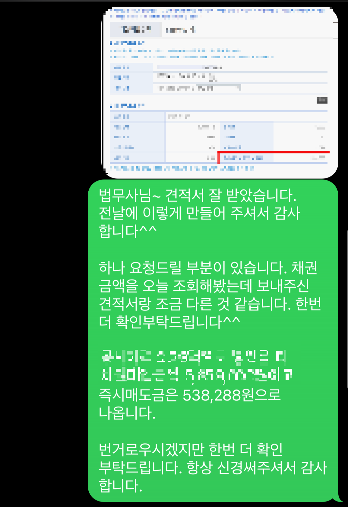 내일이 잔금일이라 오늘 먼저 견적서를 먼저 보내달라고 했다.그리고 받은 견적서에는 그 말로만 듣던,,, 거품이 낀 채권처분액이 있었다,, (???)다른 부분의 비용은 정확하게 잘 나왔는데 채권처분액이 내가 조회한 결과보다 20만원 정도 높게 나왔다.(사실 대행비 30,000원도 없어도 되는 거지만 소개해주신 사장님과 협의가 된 부분이라 패스,,)그래서 문자를 보냈다.
