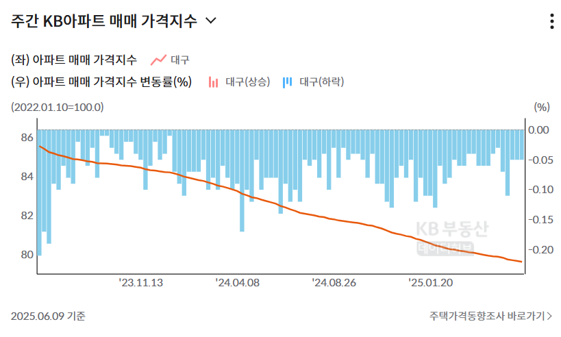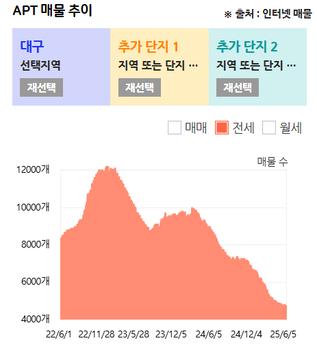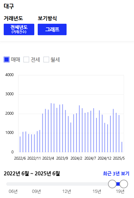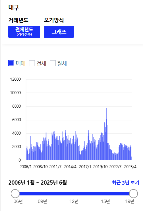 대구의 거래량은 24년에 총 27,449건으로 달 평균 2,287건이다. 2025년에는 24년의 달 평균보다도 거래량이 적다.