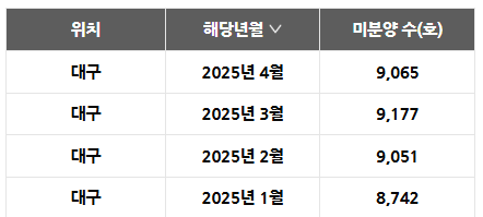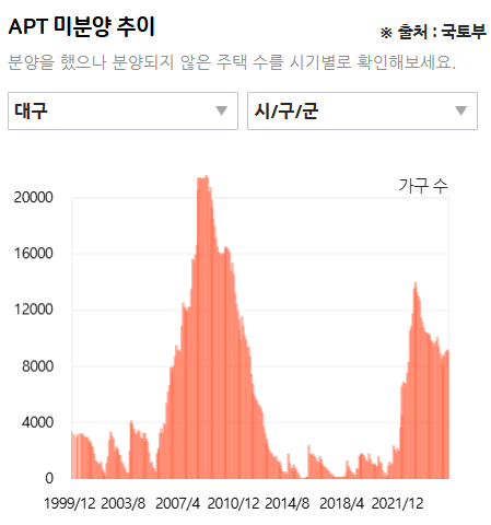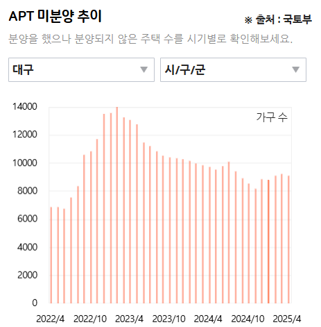 대구의 미분양은 23년 1월을 최고치로 찍고 감소했지만 최근에 다시 올라 9000호 정도 있다.