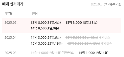 5월에 거래된 저층(4층)을 제외하고는 15억에 비슷한 가격에 거래가 되었다.