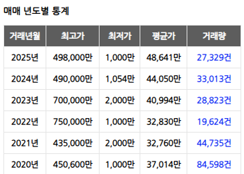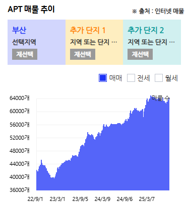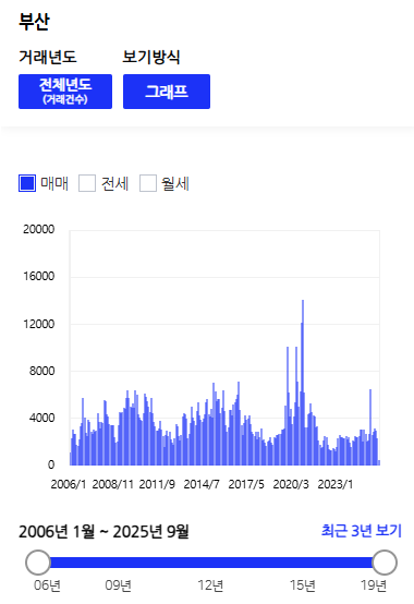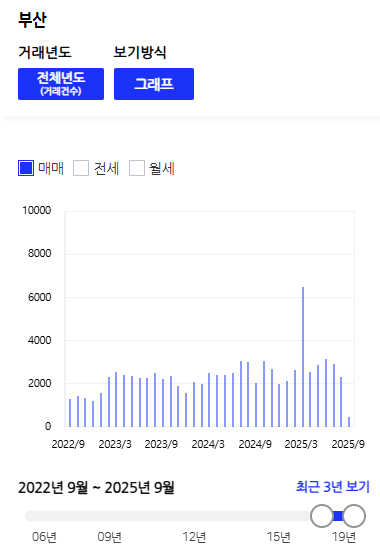 부산의 거래량은 20년도에는 8만건 이상이었고, 시장이 좋지 않았던 22년도에는 2만건도 되지 않았네요. 23년 이후로는 다시 매매 거래량이 점점 늘어나는 추세입니다.