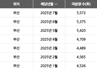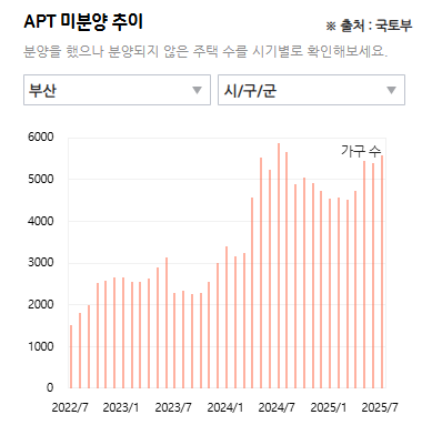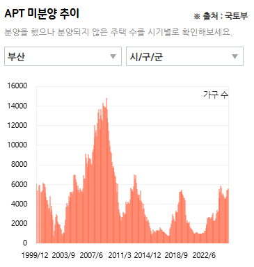부산의 미분양은 다시 상당히 높은 수준이 있으며, 최근 3년을 보더라도 미분양 매물이 높아지는 추세이다. 5000세대 이상 미분양 매물이 있다.