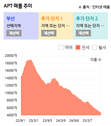 부산의 경우, 25년 이후로는 적정 수요 이하의 공급이 계속 됩니다. 10년 정도 과잉 공급을 한 부산의 흐름과는 반대되는 흐름이네요!28년까지 남구와 강서구에 큰 공급들이 많으며, 특히 27년 4월에 입주예정인 남구 대연동의 대연디아이엘은 4000세대가 넘는 공급이라 주변 전세가에 큰 영향을 줄 것 같습니다. 전세 운용에 각별히 주의를 해야할 시기인 것 같습니다! 아직 매매 매물은 거의 최고 수준이네요. 하지만 전세 매물은 계속 감소하는 추세입니다. 많은 사람들이 아직 매매 심리가 높지 않아 전세로 선택을 많이 하는 것 같습니다. (아마 매매가 보다 훨씬 낮은 전세가의 매력을 느끼는 것 같습니다.)