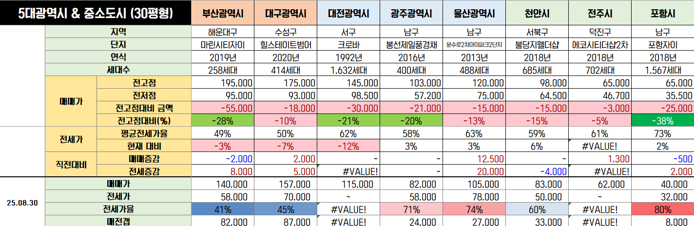1. 5대 광역시 & 중소도시 랜드마크 가격 비교 (25.08.30.)