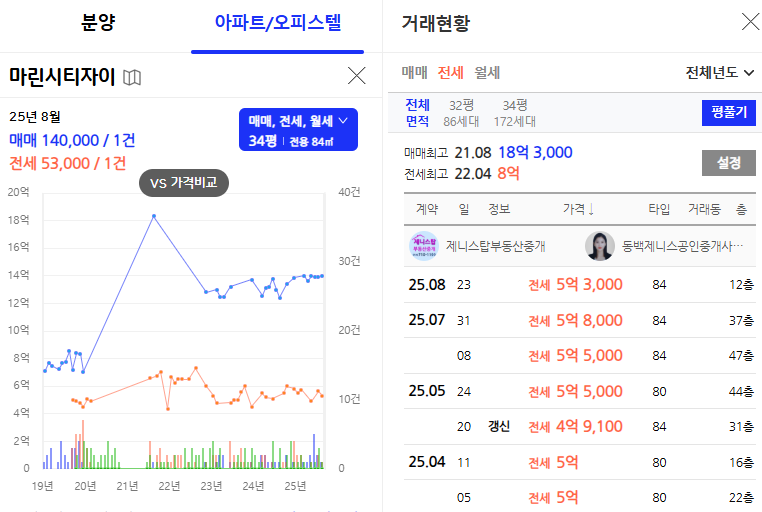 부산광역시의 랜드마크인 '마린시티자이'의 경우, 지난 2025년 7월과 비교하면 전세가가 8000만원이나 올라 있습니다.