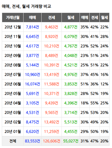 (아실 캡쳐) 매매, 전세, 월세 거래량 (왼쪽: 20년도 / 오른쪽: 25년도)