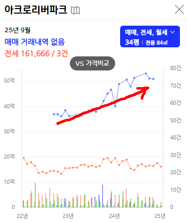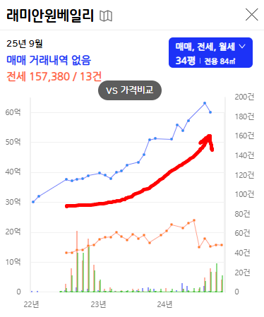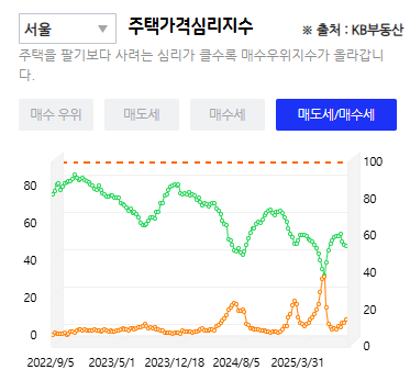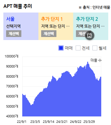 24년 초에 잠시 매매가격이 조정받는 기간을 제외하고는 24년 하반기부터 계속해서 매매 지수가 상승하는 추세입니다.