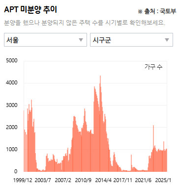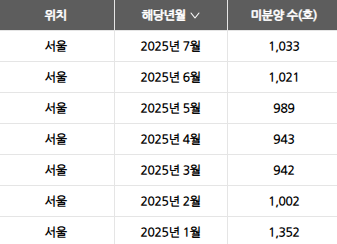 서울의 미분양은 낮은 수준이며, 절대적으로 1000세대 정도밖에 없네요. 미분양으로 인한 시장 심리의 악영향은 없어 보입니다.