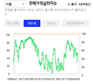 시장 심리가 아주 뜨거울 때는 매도세가 20 수준으로까지 떨어진 시기도 있었습니다.