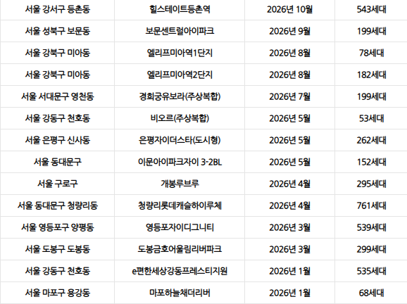 2025년 11월에 이문아이파크자이(4169세대), 2025년 12월 잠실래미안아이파크(2678세대), 2027년 11월 디에이치클래스트(5007세대)가 선호하는 입지에 의미 있는 대형 입주라 눈여겨볼 만합니다.