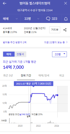 하지만 그래프에서 보듯, 그런 신축과 환경의 가치가 높은 단지들도 구축임에도 불구하고 학군의 가치를 가지는 단지의 힘을 이길 수 없네요. 부동산 가격에는 여러 요소의 영향을 받지만 대구에서는 학군의 가치가 절대적이네요.