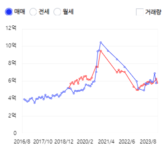 빨간색은 2020년에 입주한 신축 아파트 B단지 (전용 84) 입니다.