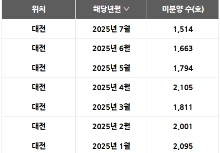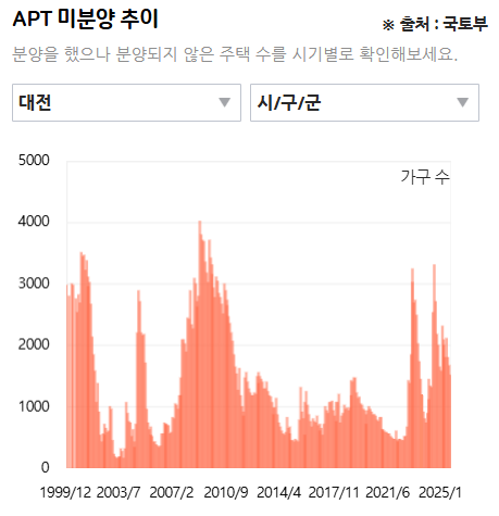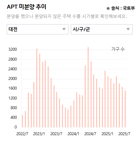 다행히 대전의 미분양을 감소하고 있는 추세입니다. 24년 6월에 3000호가 넘는 미분양 수에서 점차 감소하고 있습니다.