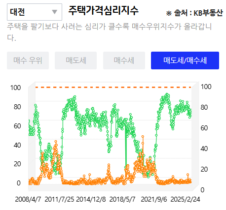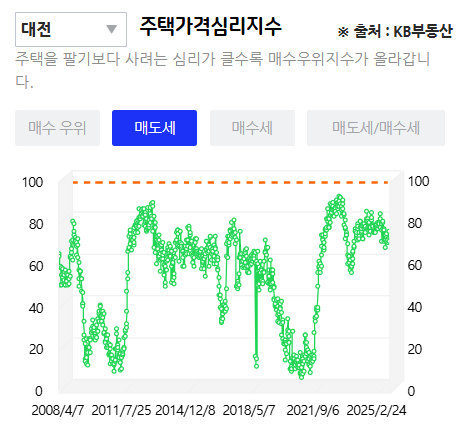 매도세는 22년도에 엄청 높았다가 지금은 살짝 감소하긴 했지만 여전히 높은 상황(70점대)입니다. (참고로 가격이 오르고 있는 서울의 경우 매도세는 50점대입니다.)
