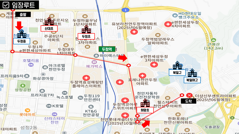 ▶ 상권 지구를 벗어나면 두정역과 주거 단지들이 있습니다. 또한 이 생활권 주변에 신축 단지들이 많이 들어올 예정입니다. 이런 변화들로 생활 환경이 개선될 수 있습니다.