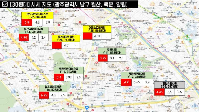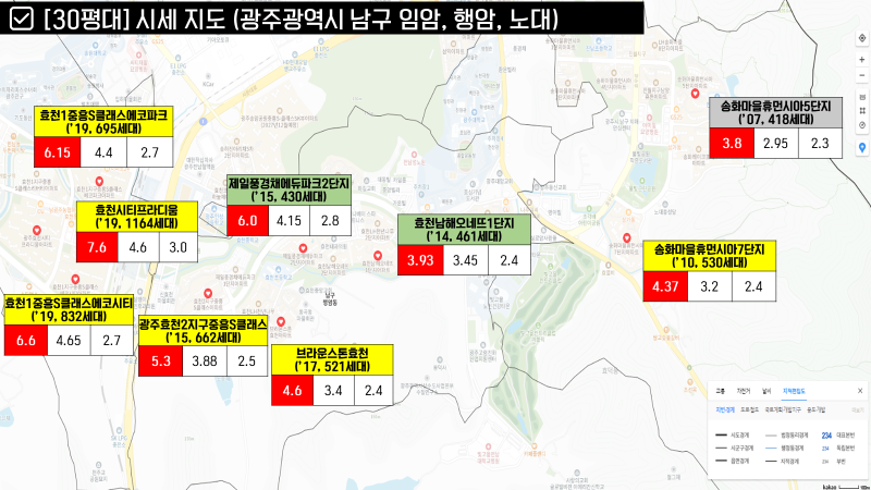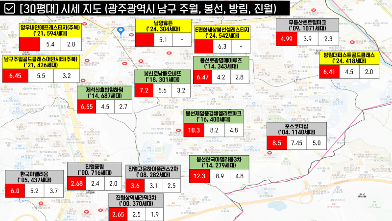 남구에서는 30평대 최고가 아파트들은 대부분 봉선동에 있습니다. (효천 생활권에도 단지가 2개 정도 있긴 하네요.)