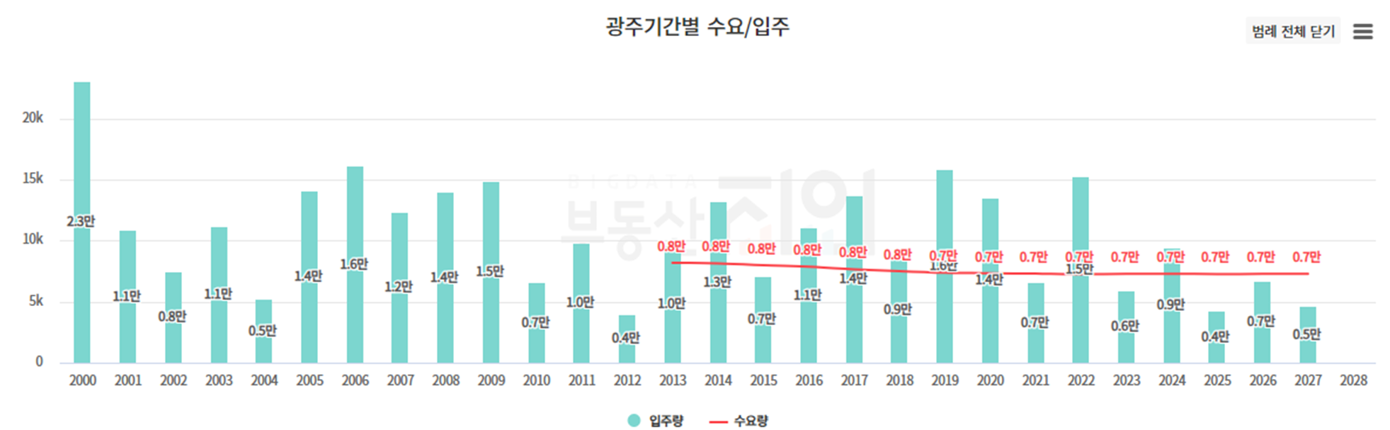 광주광역시는 2024년부터 수요량보다 낮은 입주량을 보입니다.