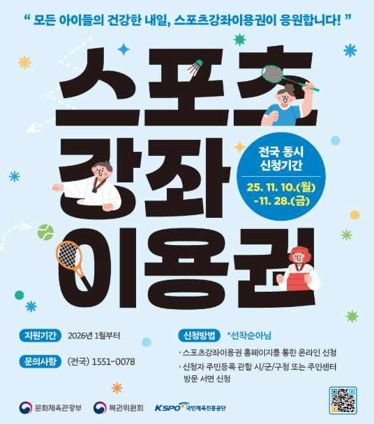 이번 포스팅에서는 스포츠강좌이용권의 신청 방법부터 주요 혜택, 대상 기준, 신청 기간, 그리고 핵심 요약까지 한눈에 알아볼 수 있도록 정리했습니다. 신청 대상을 보시고 해당되는 가정이라면 지원을 통해 큰 도움을 받을 수 있으니 서둘러 신청하시기 바랍니다.