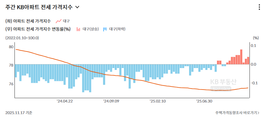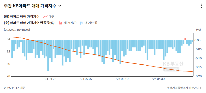 반대로 전세 가격지수가 거의 파란색인 대구의 경우 매매 가격지수도 계속해서 하락세입니다.