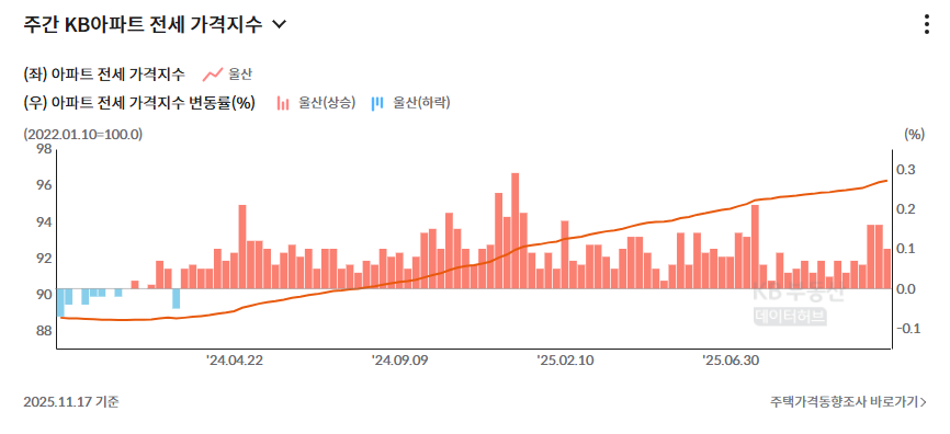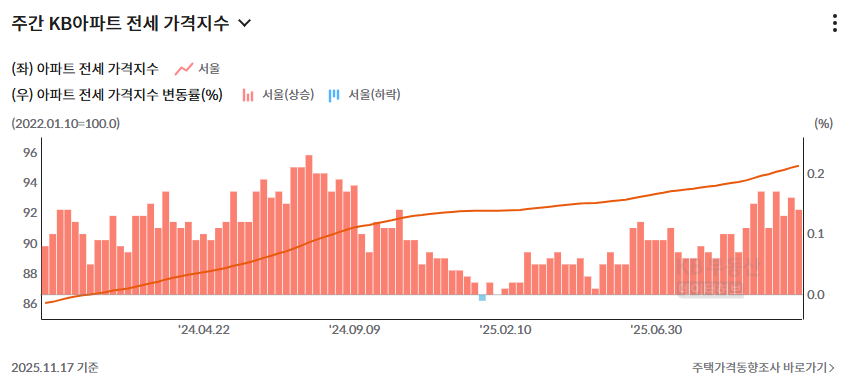 서울의 경우 24년부터 매매, 전세 가격 지수가 계속해서 상승중입니다.