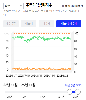 대구나 광주의 경우 거의 매도세와 매수세가 변동이 없지만, 부산의 경우 긴 터널을 지나 매도세가 살짝 머리를 굽히는 느낌입니다. 이러한 상황에서 매수세가 올라온다면 다시 부동산 시장에 가격 상승의 흐름을 가져올 수 있습니다.
