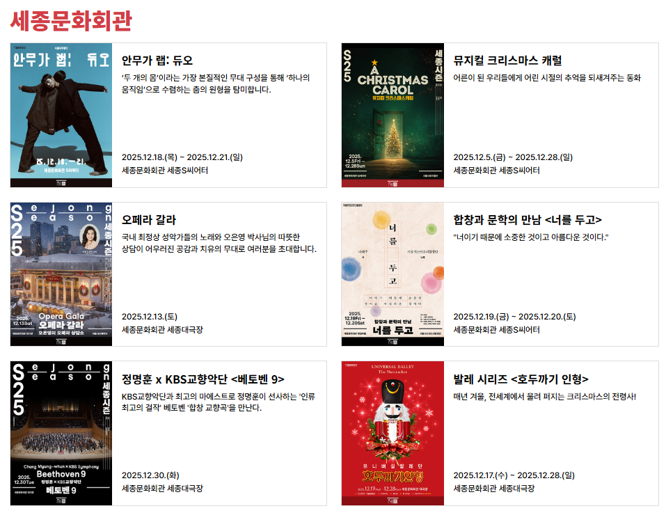 세종문화회관에서는 연말 공연 시즌을 맞아 클래식, 뮤지컬, 연극 등 다양한 장르의 공연이 펼쳐집니다. 화려한 조명과 따뜻한 공연의 조합은 겨울 분위기를 더욱 감성적으로 만들어줄 수 있습니다.