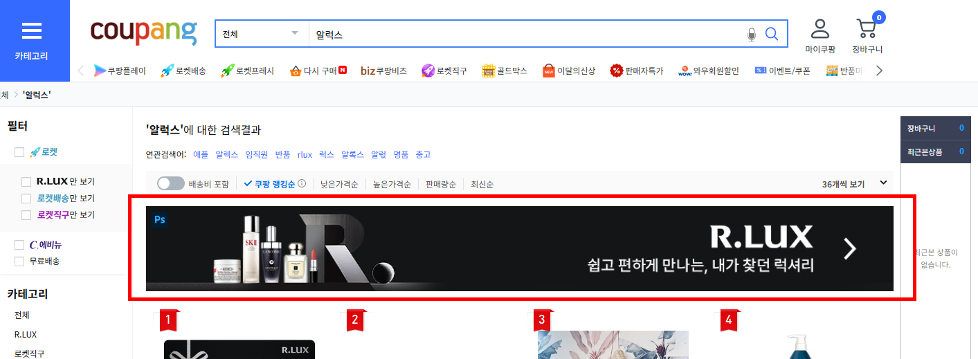 1. 쿠팡 홈페이지에서 검색창 '알럭스' 검색